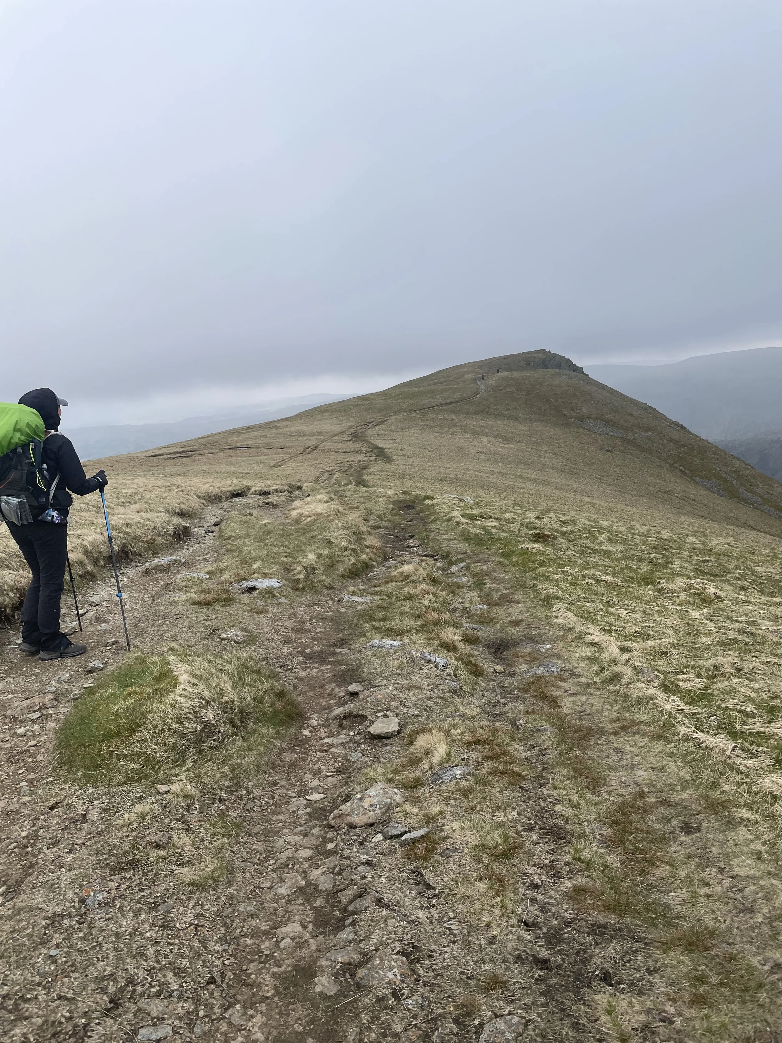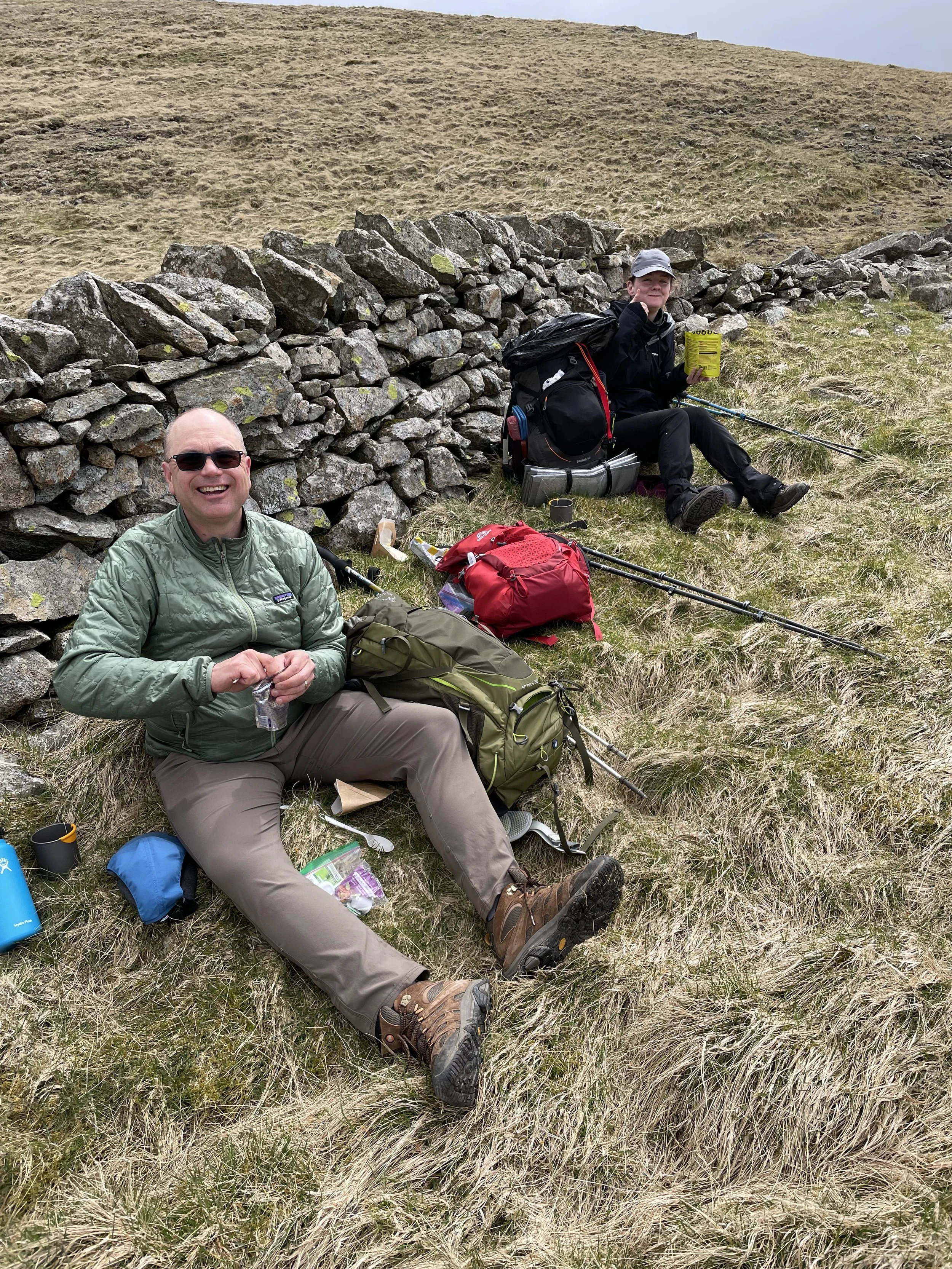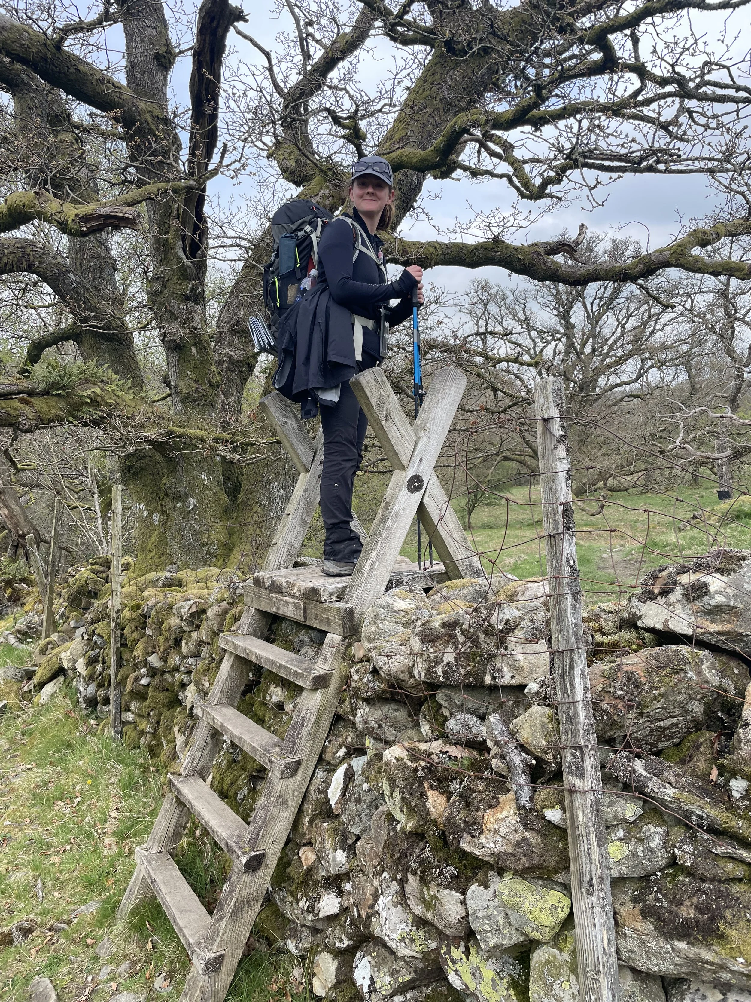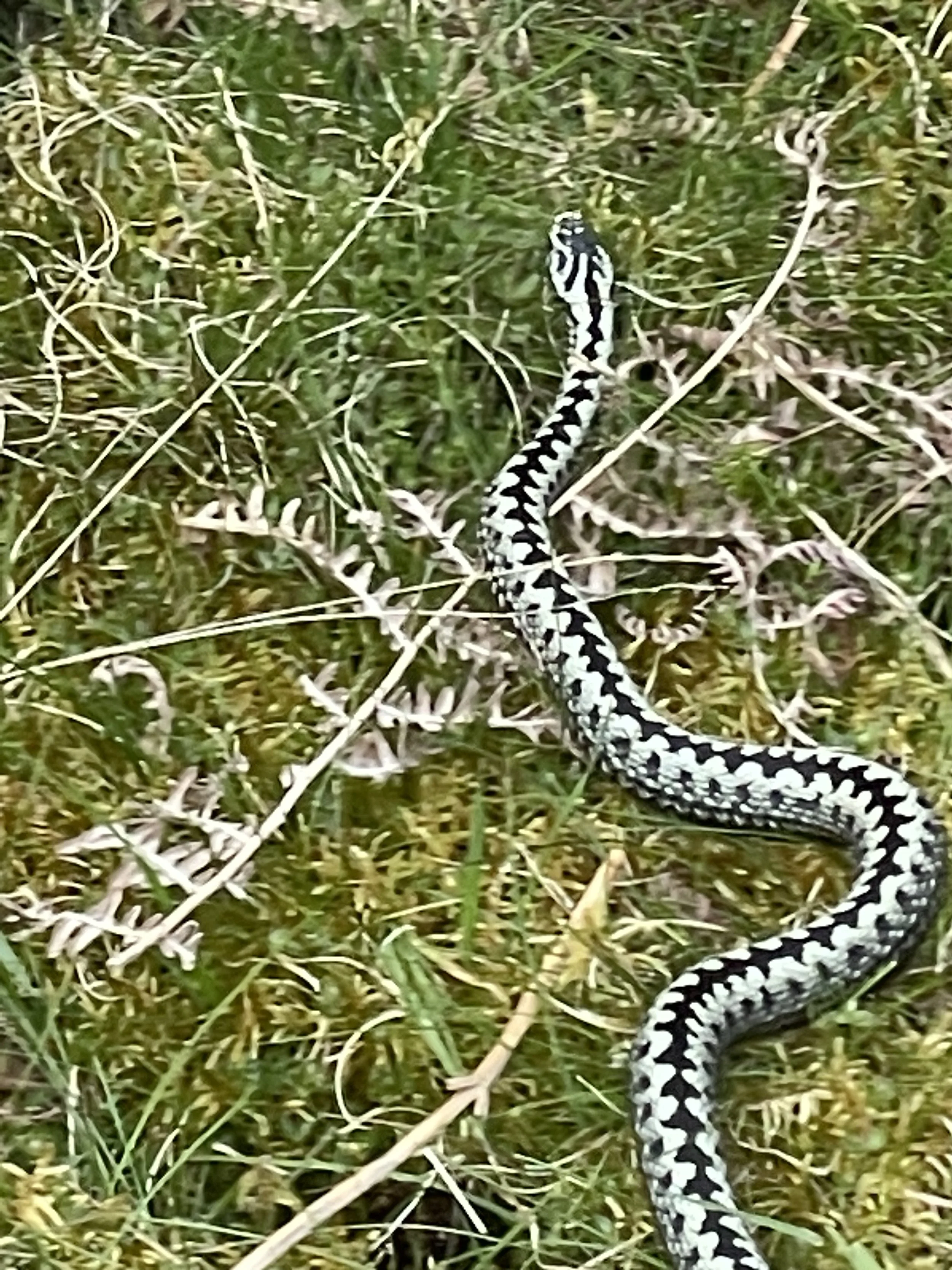 Today we steeled ourselves for our first 16-mile day- not just the longest, but also the most elevation, including up and over highest point on the trail, Kidsty Pike. The beginning was like many of our up-and-overs before but this more up and then flat, up and then flat, like a stair-step on rocky, bouldery dirt with tufts of grass. It was a cloudy day with some filtered sun and no rain with fog threatening the heights. It was chilly, maybe upper 40s/low 50s and dropping as the wind chill picked up. The land became more and more desolate the higher we climbed, and even the sheep abandoned it for warmer, lower regions. The wind became pretty unbearable for sitting and opening our packs for lunch until we came upon a dry stone wall and hopped around the backside to be in the lee, and also to have something to lean against. Perfect! Rachel was even able to fire up her stove for her freeze-dried chicken fajita! After lunch, we braved the blow squishing us up and into the peaks from the valleys so far below. I would take a step with right leg and it would land across my left and send me wobbling. I would pick up my right walking pole and the wind would take it across my body to land somewhere around my left hip and I’d then walk straight into it- not a very successful way to walk. At one point Rachel stopped and leaned straight into the wind and yelled at it, “This is DAN-GER-OUS!” Tom and I doubled over giggling as we tried to keep my pack cover from ripping off and turning me into a parasail. Zig-zagging along the sides of sweeping tundra peaks and saddles, we finally reached the summit of Kidsty Pike and danced, cheered and high-fived. After an amble down the backside, we soon encountered a steep, sit-on-your-butt and pick your way through a rocky shoot (one more spot where some switchbacks would have been a smarter alternative!), straight down for what seemed forever to Haweswater Resevoir- more high-fives for making it to flatter terrain. Across a creek and waterfall and once again among lake-lined rolling wooded sections of terrain for the next 4 miles as we followed the length of the lake, we warmed up and shed layers. Two surprises on this section delighted us- and we would have had no clue about the existence or importance of either unless Rachel were with us. Suddenly she squealed and hopped and exclaimed “Adder, adder, adder!” At first, knowing an adder is a snake, I assumed her strong reaction was meant to alert us to danger. Ready to run, use my pole as a spear, or stay stock still (Is an Adder like a bear? Do we get big and yell “Hey Adder!” Or like a mountain lion and look away and get small and still?) But there was just a hint of joy in her screams. Yes, that was it; she was excited! Turns out Adder are very rare and hang out in this exact environment- in dead brown Bracken Fern fronds sunning themselves. It was not a big snake, maybe half to 3/4 inch in diameter and a very pale blue with a black pattern that looked just like the dead fern pattern- see pic below. Apparently, this was a hugely rare sighting- very cool to be a part of it! The second surprise was she spotted Red Deer way up on the high top hillside near some sheep. Too far for a picture. Rachel said she’s only ever seen them in Scotland. After what seemed an eternity of hiking, we arrived at the reservoir dam at the end of the Haweswater, and ahead we could see the terrain change to the green checkerboard of English farms, signaling effectively the end of the Lake District. Many of us Coast to Coasters approached this part thinking, ok, we’re almost done today, surely Shap is in view. But noooooo! The hours of plodding forward continued as we entered rolling cattle land along an oak lined river, then up over stiles and across sheep grass to yet another stile or gate. More grass, more hills, more bogs. Our weary bodies were numb and our weary eyes had a little lift when we spotted a whole pack of lambs frolicking together, playing hide and seek and tag, a veritable lamb kindergarten, while the ewes stood spread out all over munching on grass, not the least interested. At the ruins of Shap Abbey, signage said we were still 3/4 mile from Shap and Rachel said feeling at about 1 out of scale of 10. We were all grumpy and just done. At 6:45pm, about 9+ hours after we set out, we finally arrived, threw our things in our places and nearly ran to the famous Shap Chippy Shop for fish and chips that we ate with Rachel at her hostel stay because we had to order take away. At last, to bed!!!