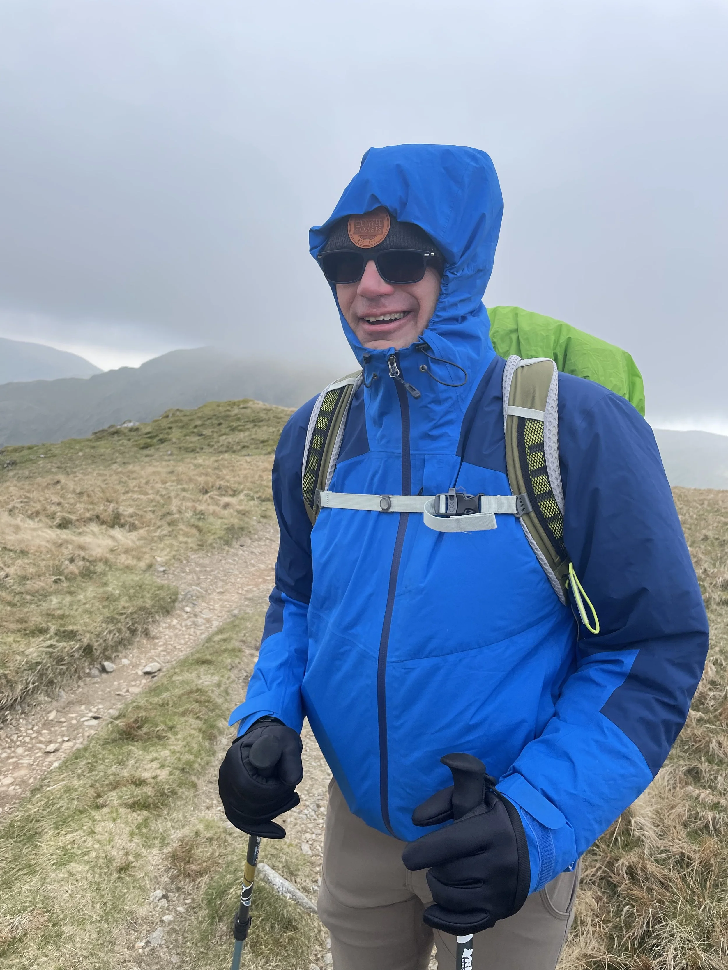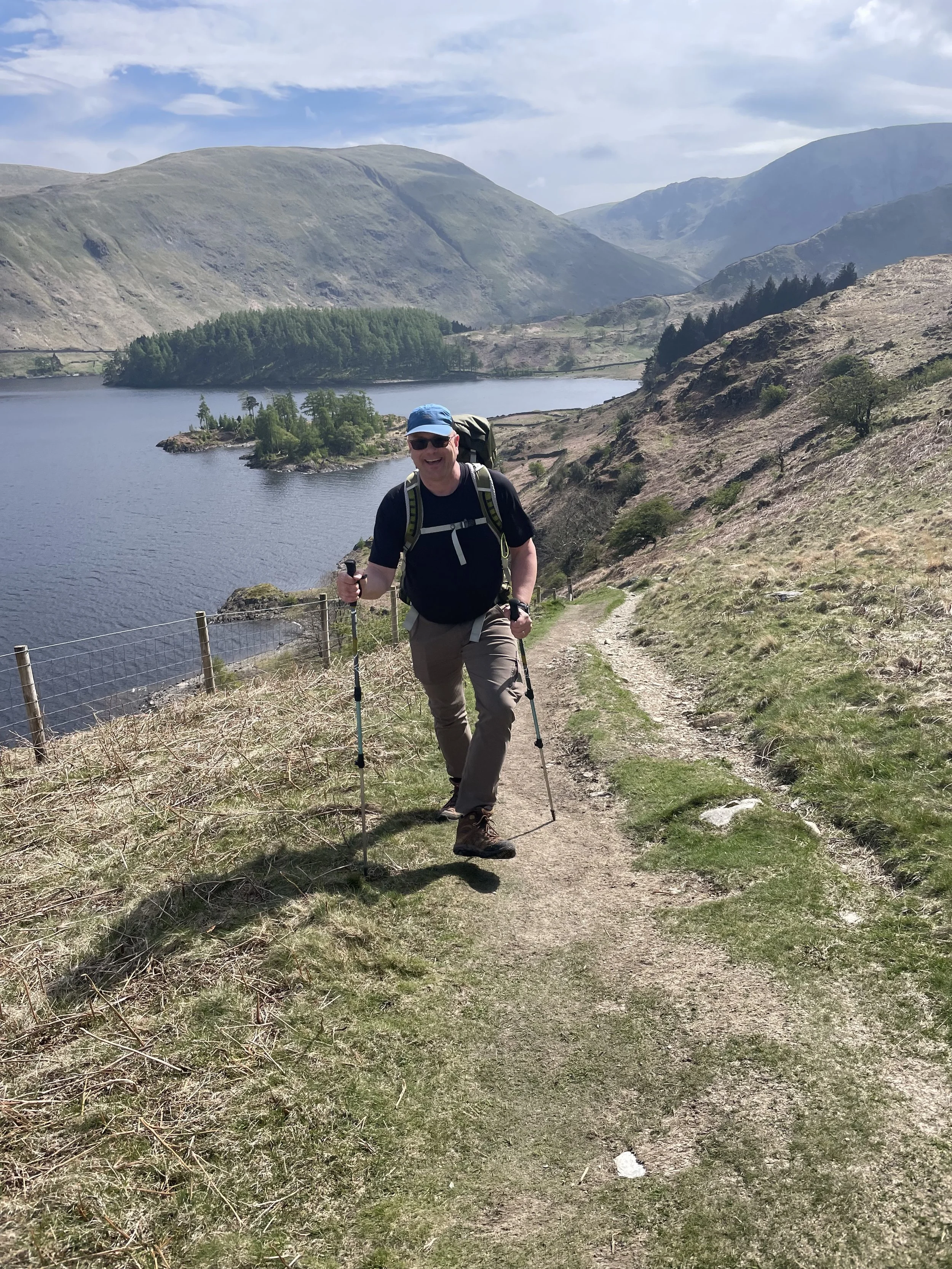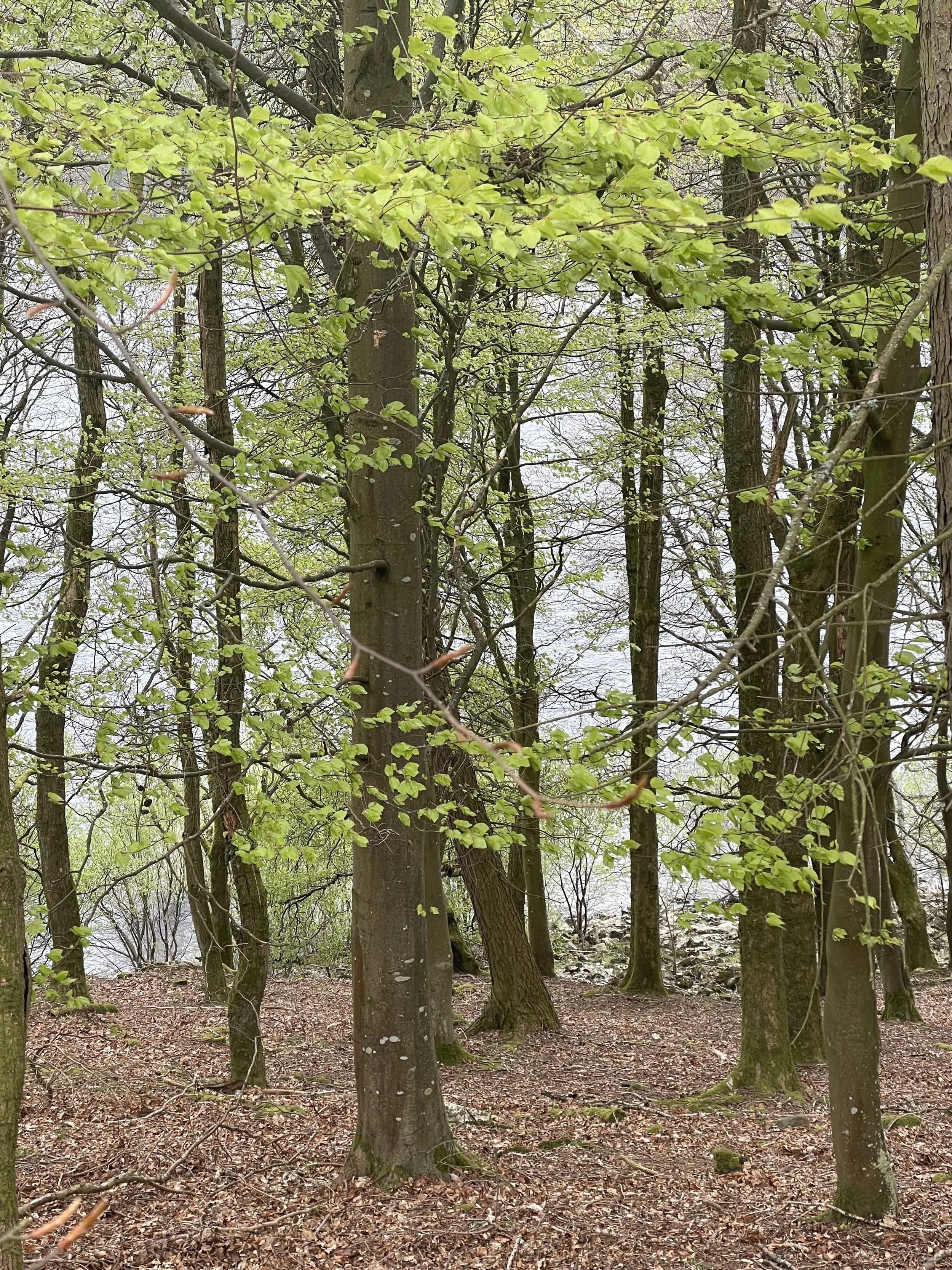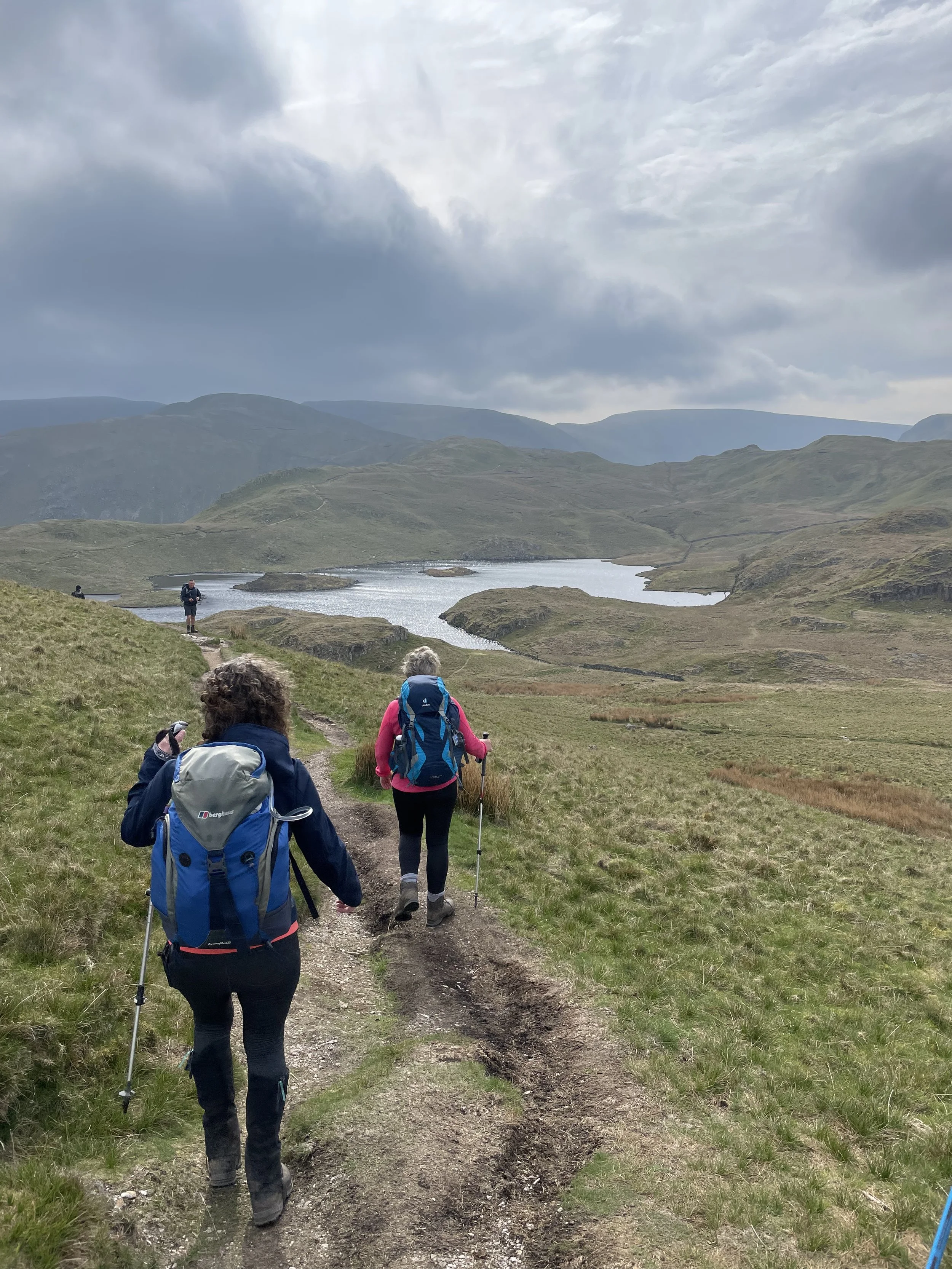 Today we steeled ourselves for our first 16-mile day- not just the longest, but also the most elevation, including up and over highest point on the trail, Kidsty Pike. The beginning was like many of our up-and-overs before but this more up and then flat, up and then flat, like a stair-step on rocky, bouldery dirt with tufts of grass. It was a cloudy day with some filtered sun and no rain with fog threatening the heights. It was chilly, maybe upper 40s/low 50s and dropping as the wind chill picked up. The land became more and more desolate the higher we climbed, and even the sheep abandoned it for warmer, lower regions. The wind became pretty unbearable for sitting and opening our packs for lunch until we came upon a dry stone wall and hopped around the backside to be in the lee, and also to have something to lean against. Perfect! Rachel was even able to fire up her stove for her freeze-dried chicken fajita! After lunch, we braved the blow squishing us up and into the peaks from the valleys so far below. I would take a step with right leg and it would land across my left and send me wobbling. I would pick up my right walking pole and the wind would take it across my body to land somewhere around my left hip and I’d then walk straight into it- not a very successful way to walk. At one point Rachel stopped and leaned straight into the wind and yelled at it, “This is DAN-GER-OUS!” Tom and I doubled over giggling as we tried to keep my pack cover from ripping off and turning me into a parasail. Zig-zagging along the sides of sweeping tundra peaks and saddles, we finally reached the summit of Kidsty Pike and danced, cheered and high-fived. After an amble down the backside, we soon encountered a steep, sit-on-your-butt and pick your way through a rocky shoot (one more spot where some switchbacks would have been a smarter alternative!), straight down for what seemed forever to Haweswater Resevoir- more high-fives for making it to flatter terrain. Across a creek and waterfall and once again among lake-lined rolling wooded sections of terrain for the next 4 miles as we followed the length of the lake, we warmed up and shed layers. Two surprises on this section delighted us- and we would have had no clue about the existence or importance of either unless Rachel were with us. Suddenly she squealed and hopped and exclaimed “Adder, adder, adder!” At first, knowing an adder is a snake, I assumed her strong reaction was meant to alert us to danger. Ready to run, use my pole as a spear, or stay stock still (Is an Adder like a bear? Do we get big and yell “Hey Adder!” Or like a mountain lion and look away and get small and still?) But there was just a hint of joy in her screams. Yes, that was it; she was excited! Turns out Adder are very rare and hang out in this exact environment- in dead brown Bracken Fern fronds sunning themselves. It was not a big snake, maybe half to 3/4 inch in diameter and a very pale blue with a black pattern that looked just like the dead fern pattern- see pic below. Apparently, this was a hugely rare sighting- very cool to be a part of it! The second surprise was she spotted Red Deer way up on the high top hillside near some sheep. Too far for a picture. Rachel said she’s only ever seen them in Scotland. After what seemed an eternity of hiking, we arrived at the reservoir dam at the end of the Haweswater, and ahead we could see the terrain change to the green checkerboard of English farms, signaling effectively the end of the Lake District. Many of us Coast to Coasters approached this part thinking, ok, we’re almost done today, surely Shap is in view. But noooooo! The hours of plodding forward continued as we entered rolling cattle land along an oak lined river, then up over stiles and across sheep grass to yet another stile or gate. More grass, more hills, more bogs. Our weary bodies were numb and our weary eyes had a little lift when we spotted a whole pack of lambs frolicking together, playing hide and seek and tag, a veritable lamb kindergarten, while the ewes stood spread out all over munching on grass, not the least interested. At the ruins of Shap Abbey, signage said we were still 3/4 mile from Shap and Rachel said feeling at about 1 out of scale of 10. We were all grumpy and just done. At 6:45pm, about 9+ hours after we set out, we finally arrived, threw our things in our places and nearly ran to the famous Shap Chippy Shop for fish and chips that we ate with Rachel at her hostel stay because we had to order take away. At last, to bed!!!